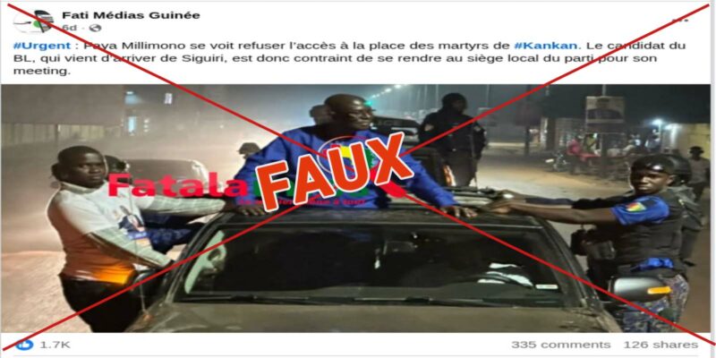 En campagne, le candidat du Bloc Liberal (BL), Faya Millimono a entamé sa tournée de l’intérieur par la Haute Guinée. Le 06 décembre, il arrive à Kankan, la plus grande ville de la région. Quelques heures plus tard, l’auteur de cette publication sur Facebook affirme que “Faya Millimono se voit refuser l’accès à la place des martyrs de #Kankan” ( lien archivé ici) Il poursuit que “ le candidat du BL, qui vient d’arriver de Siguiri, est donc contraint de se rendre au siège local du parti pour son meeting.”