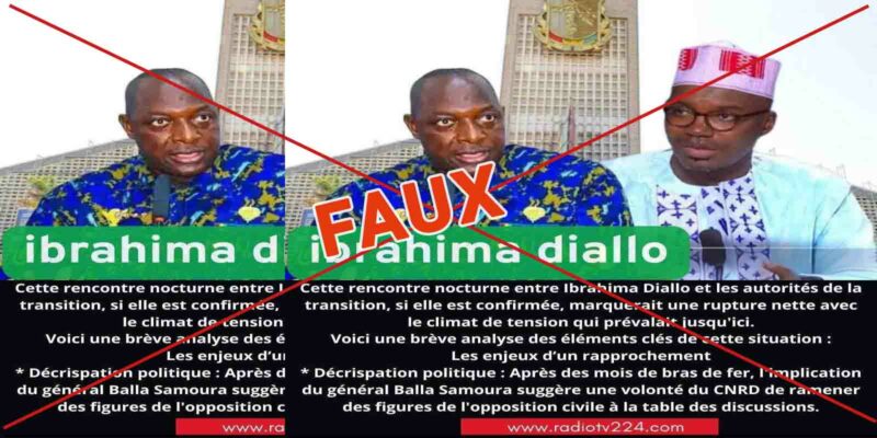 Le 25 janvier 2026, une allégation partie de ce site d’information (lien archivé ici) a largement été amplifiée sur les réseaux sociaux, particulièrement Facebook (ici, là et là). Son auteur, un.e certain.e Djiba Camara, affirme sans apporter des preuves qu’une réconciliation « surprise » aurait eu lieu entre le Comité national du rassemblement et du développement (CNRD) et le Front national pour la défense de la Constitution (FNDC).